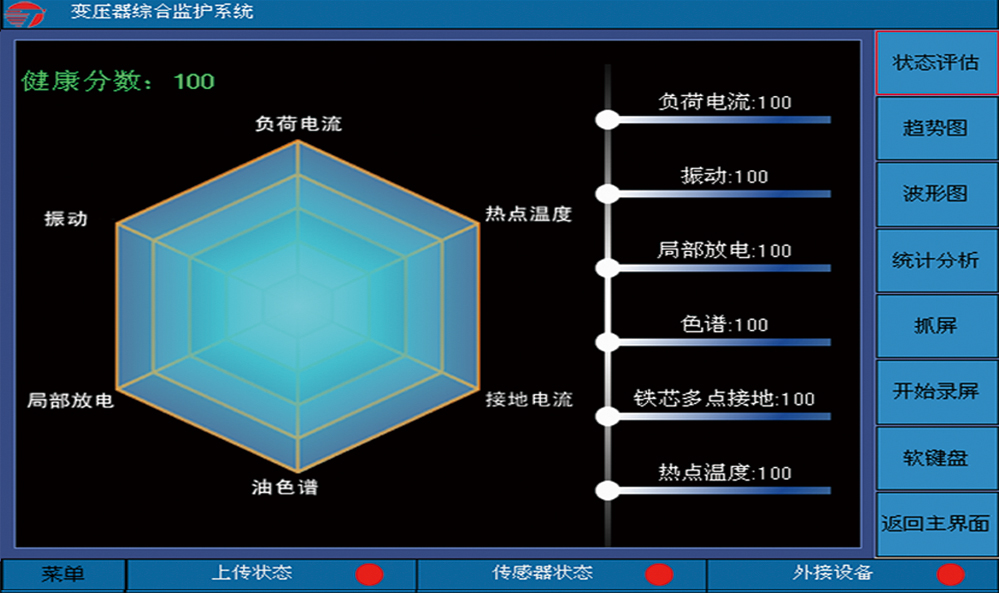 6、內(nèi)置變壓器絕緣缺陷診斷系統(tǒng),實(shí)時(shí)、快速給出變壓器健康狀態(tài),將健康狀態(tài)進(jìn)行量化,形成健康指數(shù)直觀展示。